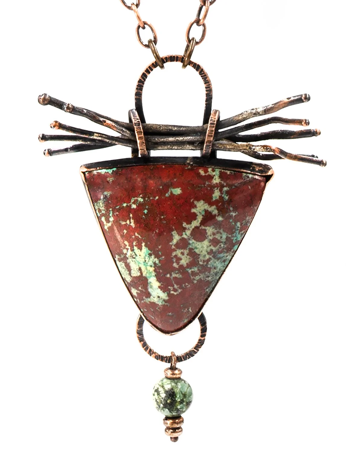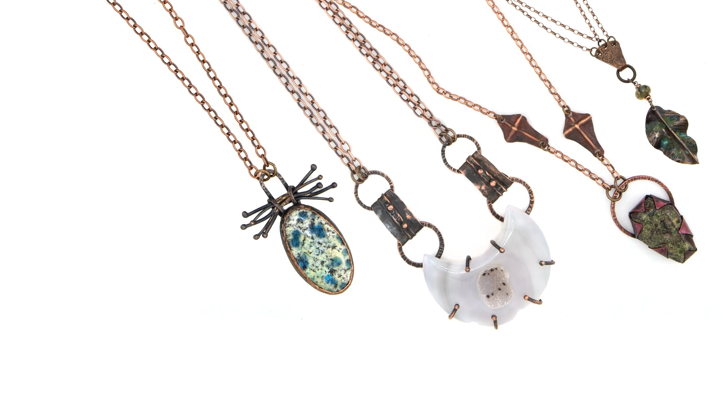 Nature-inspired handcrafted jewelry, made from copper, and sometimes sterling silver or brass. Much of the jewelry is created using a technique known as fold-forming. It is a technique in which the metal is annealed (heated) repeatedly while folding, unfolding, forging, and forming the metal. Etching and traditional metalsmith techniques are often combined with the folding of the metal. Stones, beads, found objects, or handmade metal and beaded chains are sometimes included. Each piece of jewelry is a small sculptural piece of wearable art that celebrates the natural world.